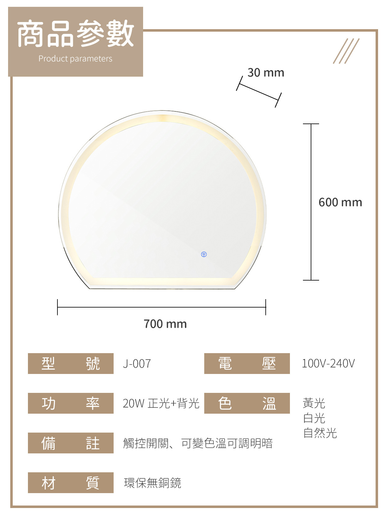 20W|觸控型環保無銅鏡燈 J-007