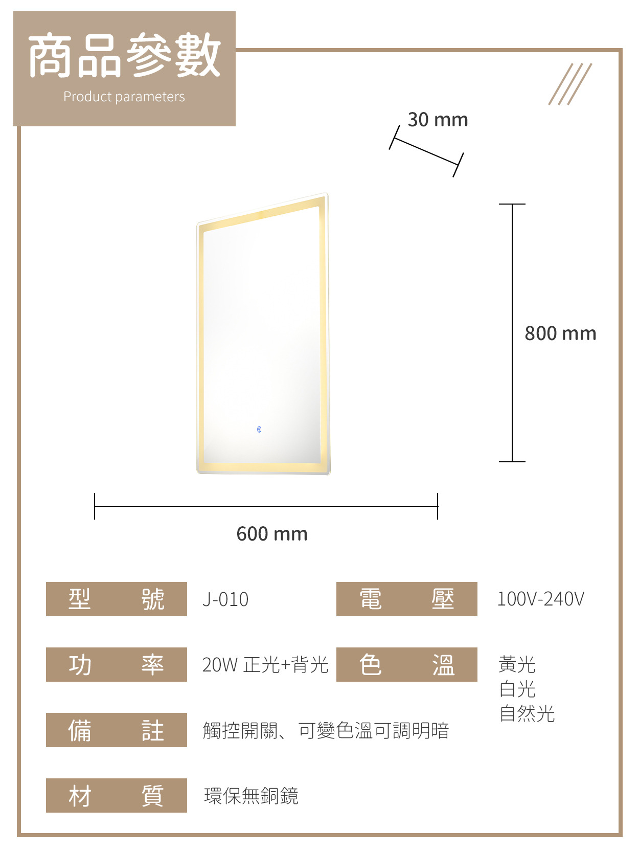 20W|觸控型環保無銅鏡燈 J-010