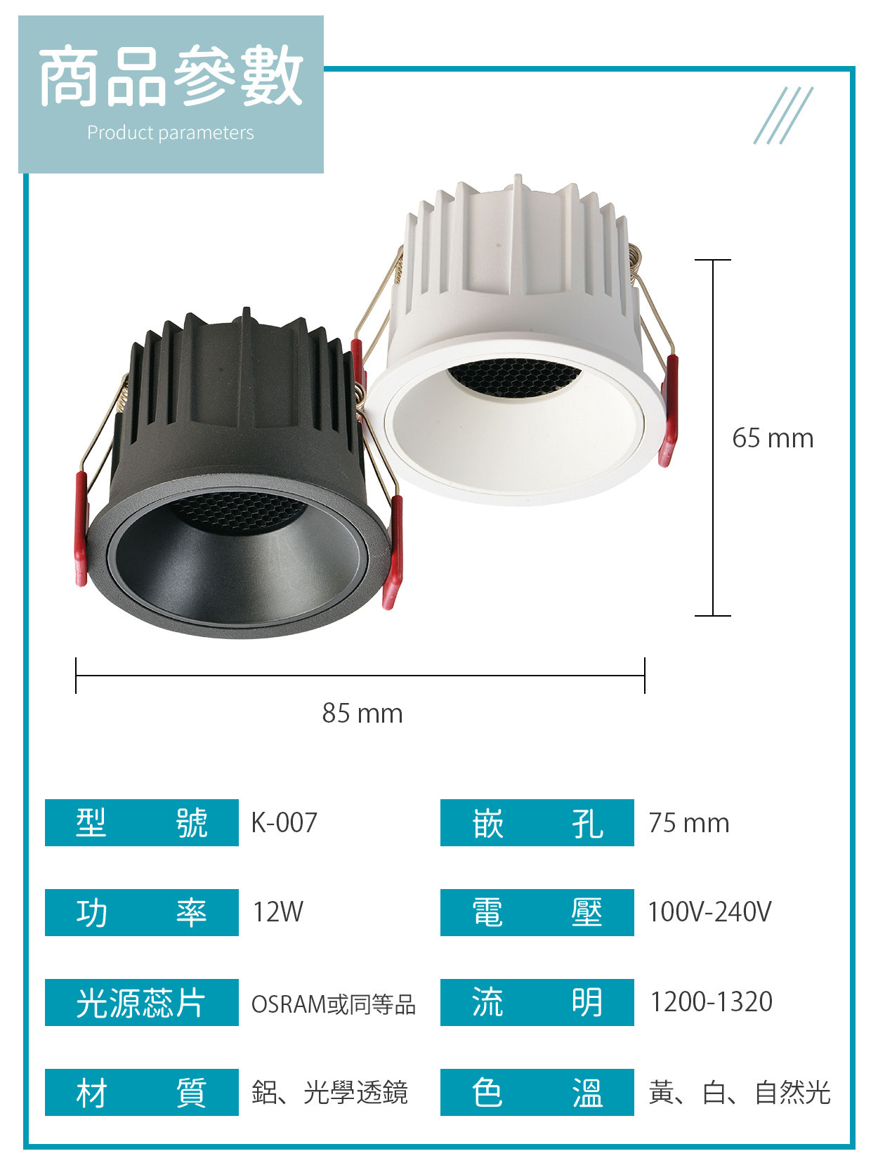 7.5公分|12W蜂巢防眩崁燈 K-007