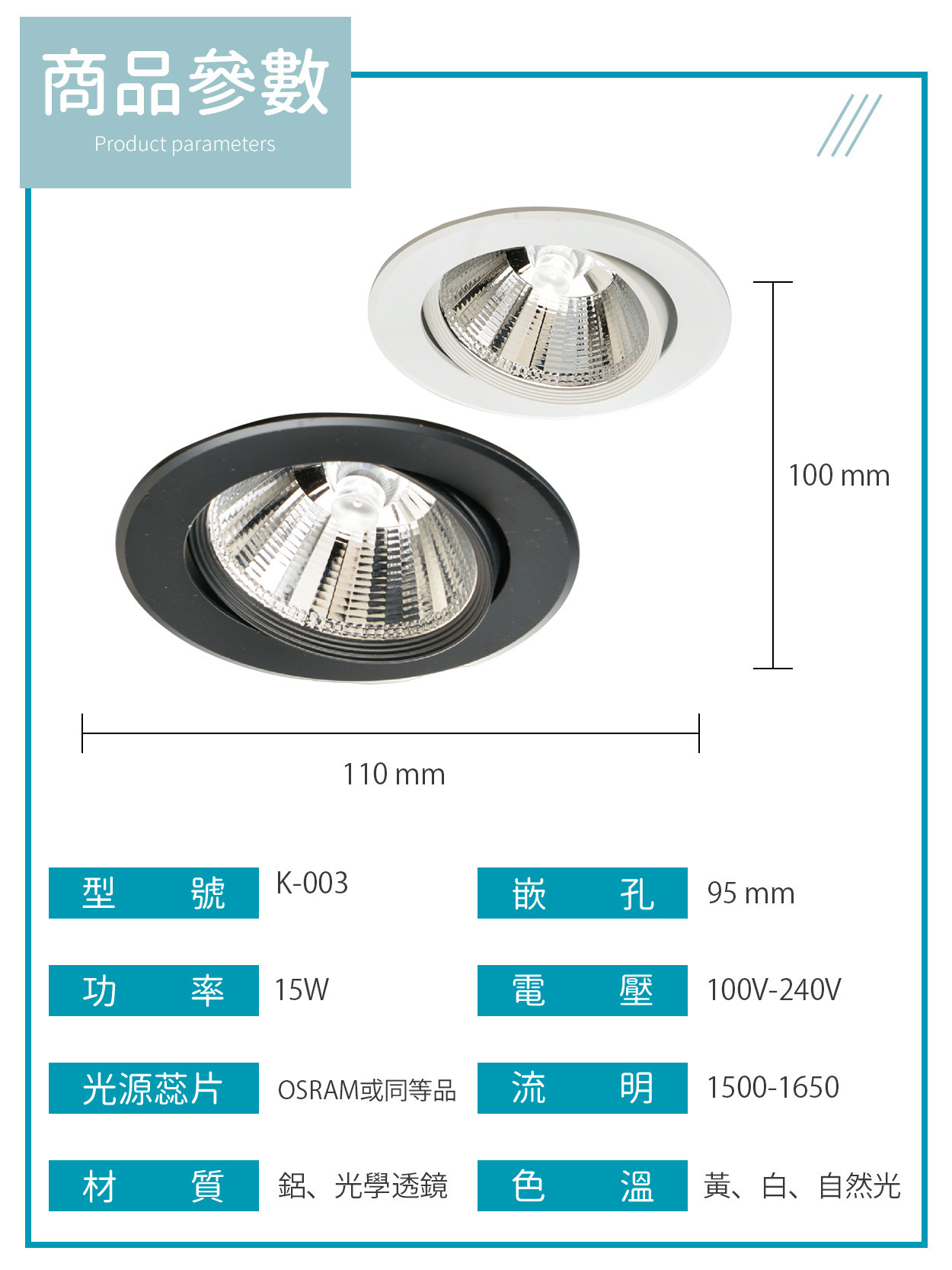 9公分|15W可調角聚光崁燈 K-R003