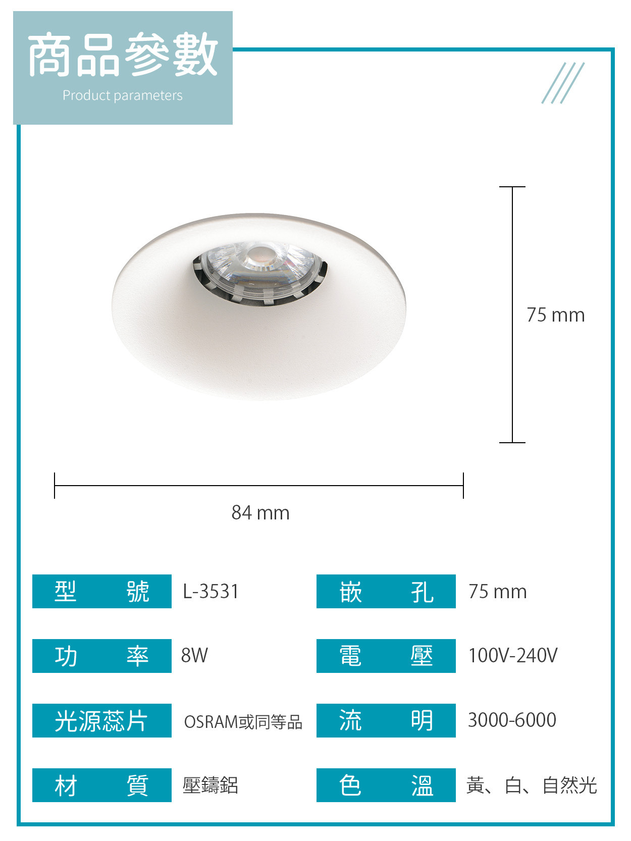 7.5公分|MR16內凹防眩崁燈 L-3531